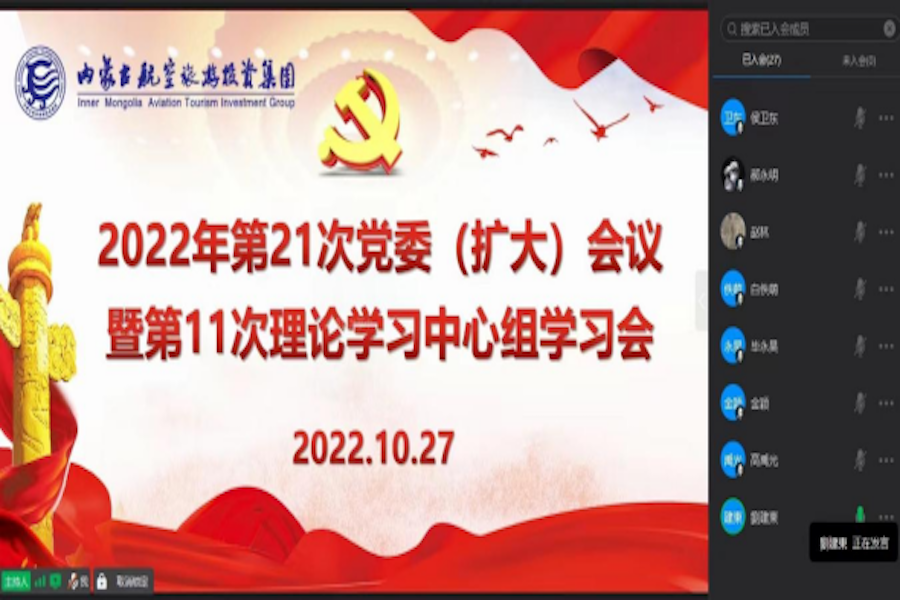 10月27日,內(nèi)蒙古航空旅游投資集團(tuán)黨委書記、董事長(zhǎng)劉建東通過(guò)視頻形式主持召開(kāi)第21次黨委(擴(kuò)大)會(huì)議暨第11次理論學(xué)習(xí)中心組學(xué)習(xí)會(huì),專題學(xué)習(xí)黨的二十大精神,安排部署宣傳貫徹落實(shí)工作。
