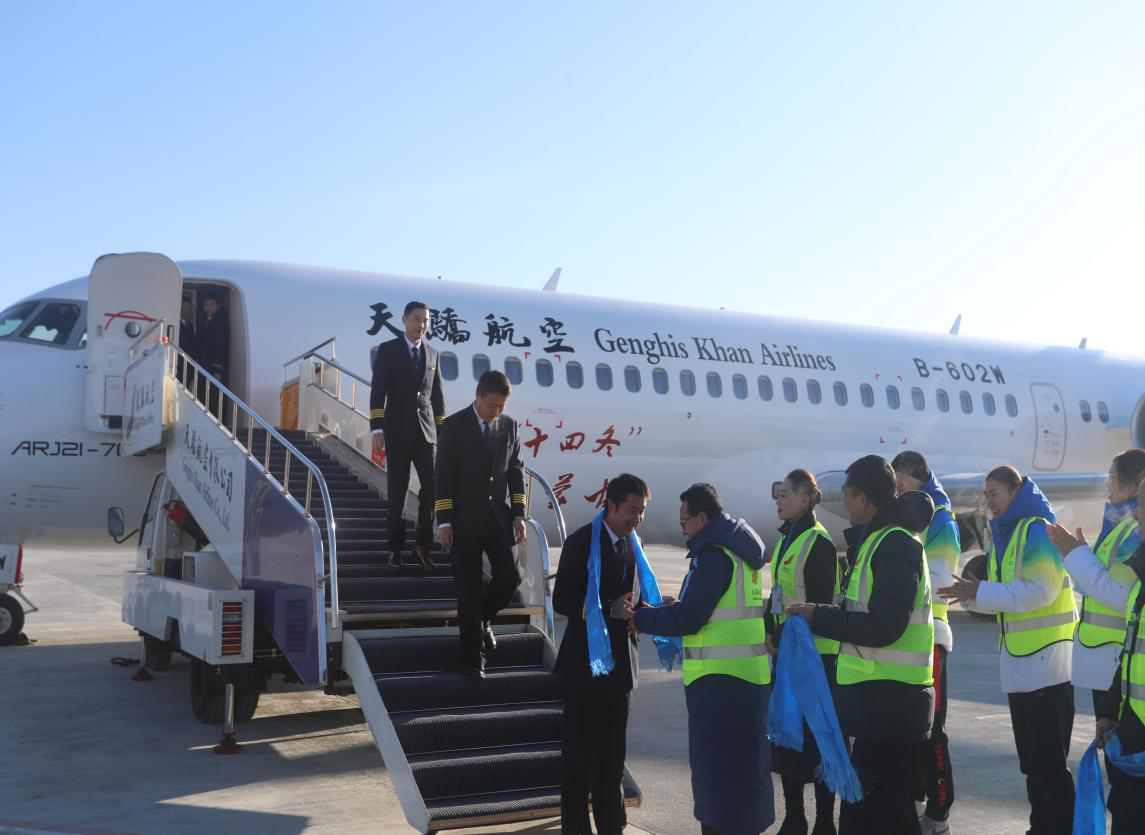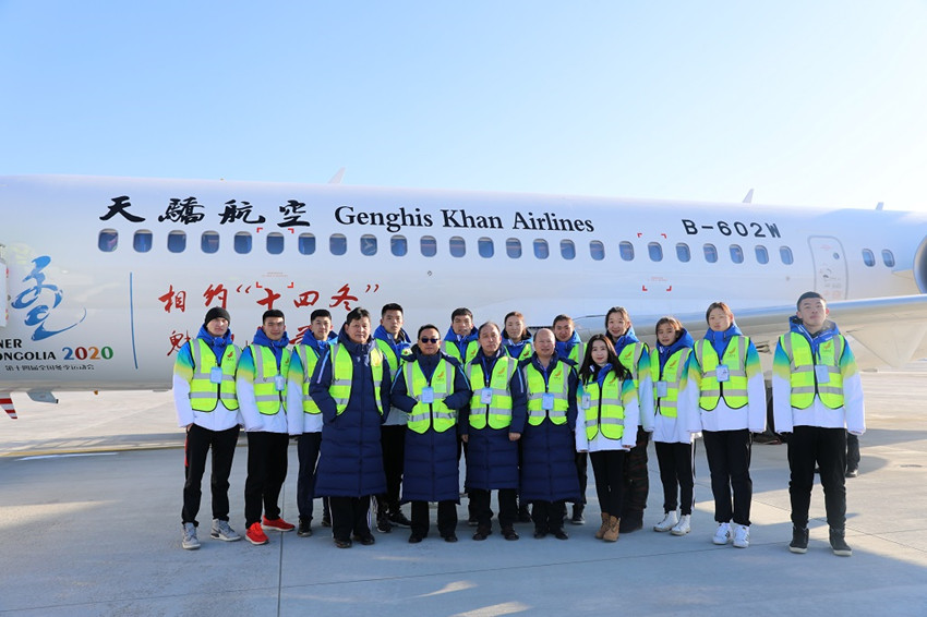 2019年12月31日,身著第十四屆全國冬運會會徽和相約“十四冬”、魅力內(nèi)蒙古字樣的飛機平穩(wěn)降落在呼和浩特白塔國際機場,正式加入天驕航空機隊。自治區(qū)體育局副局長李志友,內(nèi)蒙古交通投資集團副總經(jīng)理、天驕航空總裁郝玉濤等在客梯車下迎接“十四冬號”機組,并獻(xiàn)上哈達(dá)。