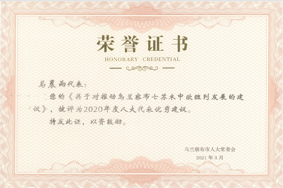 2021年3月22日烏蘭察布市人大常委會表彰了2020年度人大代表優(yōu)秀建議和先進承辦單位。內(nèi)蒙古外貿(mào)公司班列部經(jīng)理馬晨雨作為烏蘭察布市集寧區(qū)人大代表,提交的《關(guān)于對推動烏蘭察布七蘇木中歐班列發(fā)展的建議》被評為優(yōu)秀建議。議題的主旨是結(jié)合內(nèi)蒙古外貿(mào)公司在承接自治區(qū)中歐班列發(fā)運任務(wù)過程中的經(jīng)驗及烏蘭察布市自身的區(qū)位優(yōu)勢,對烏蘭察布市中歐班列發(fā)展提出的合理化建議。