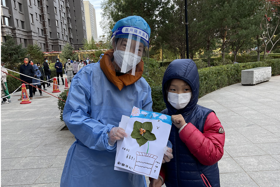 “阿姨,我有一幅畫要送給你們,謝謝你們!”前幾天,內(nèi)蒙古航旅集團(tuán)戰(zhàn)略規(guī)劃部職工張競正在協(xié)助核酸檢測時,一名小女孩拿著自己親手畫的畫送給她,用稚嫩又真摯的畫筆表達(dá)謝意。